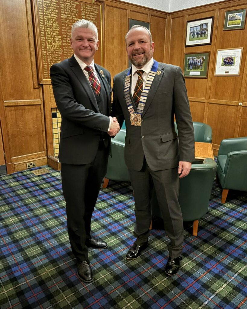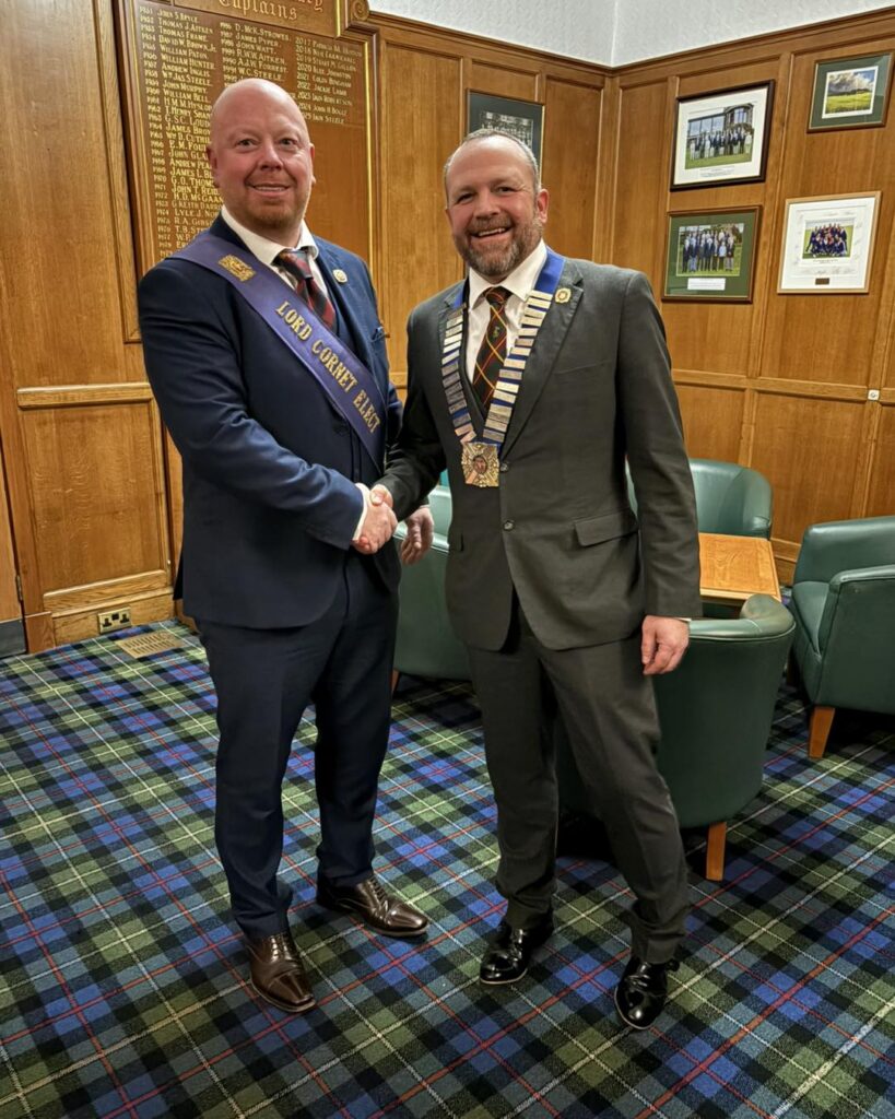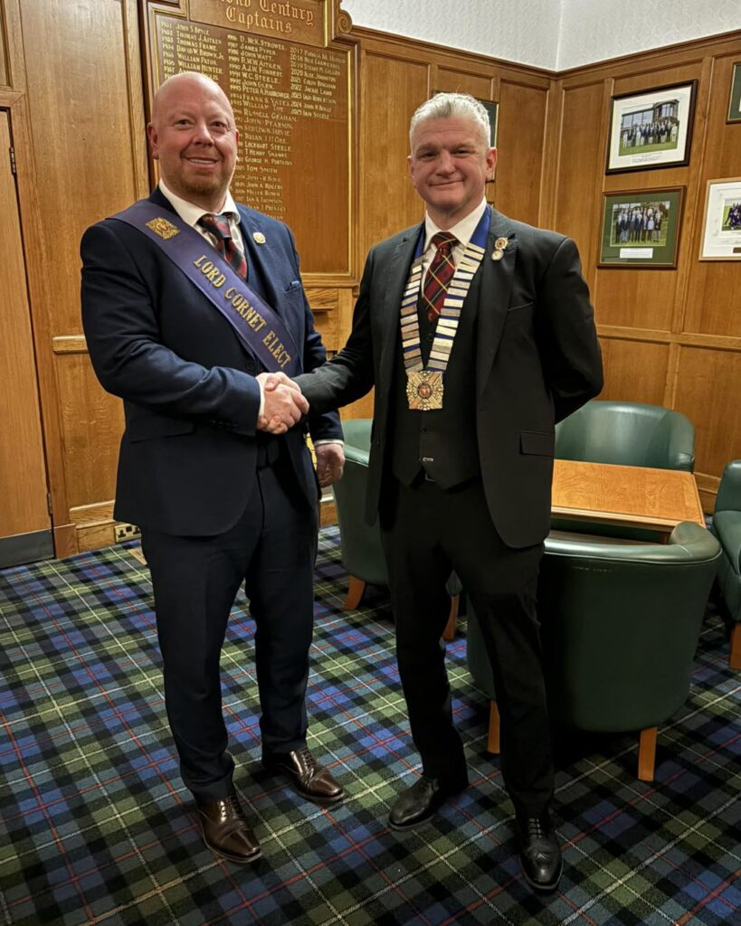 Lord Cornet Elect Karl Stewart was welcomed to the Club by the outgoing President, Ex Lord Cornet Iain Hughes, who presented him with his Lord Cornet Elect Sash, Brass Badge, and Club Tie.